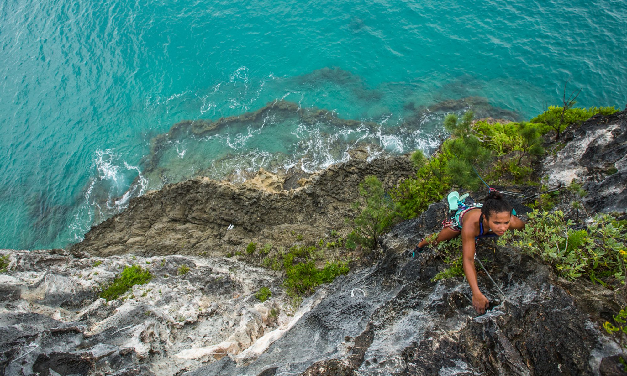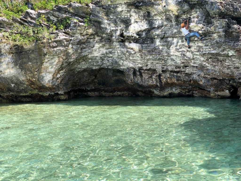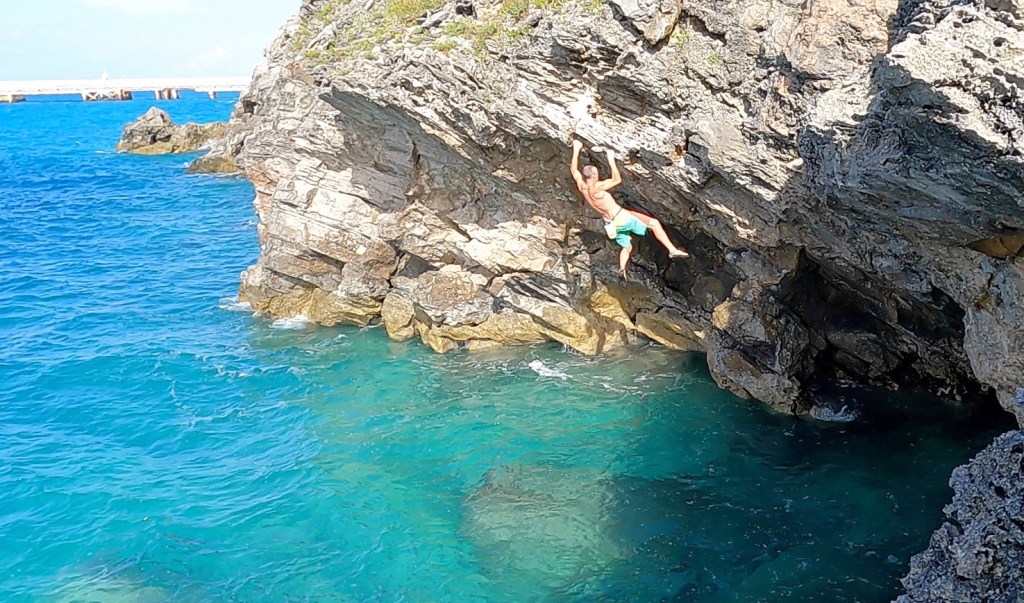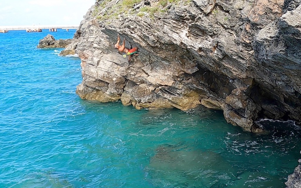 Sea-level traverse in to a sloping ledge. Continue traversing down and left for ten feet and then climb directly to the top. Dreas Ratteray 9 March 2022.