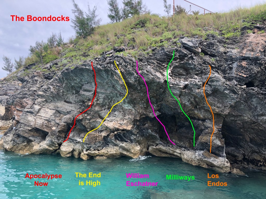 The north coast of St George’s has a lot of rock but none of it hangs together as a DWS venue apart from The Boondocks which gives short, steep routes on good rock above shallow water. You definitely need high tide.