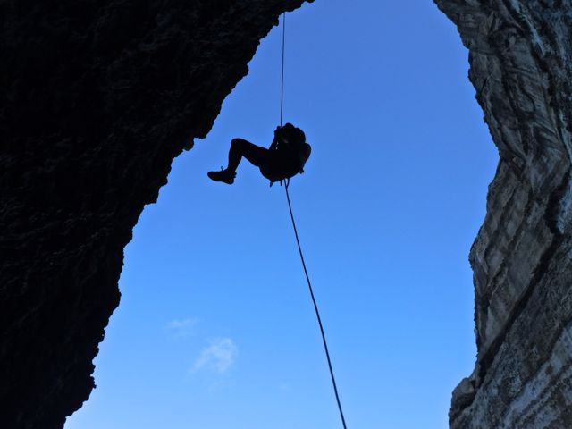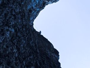 The 80-foot roof and how you get round it is a spectacular part of the route, but not the main part – that is reserved for the headwall. An abseil from the lip lands you in the sea; we should know, we did it then had to climb the route again to get back there and finish the headwall.
