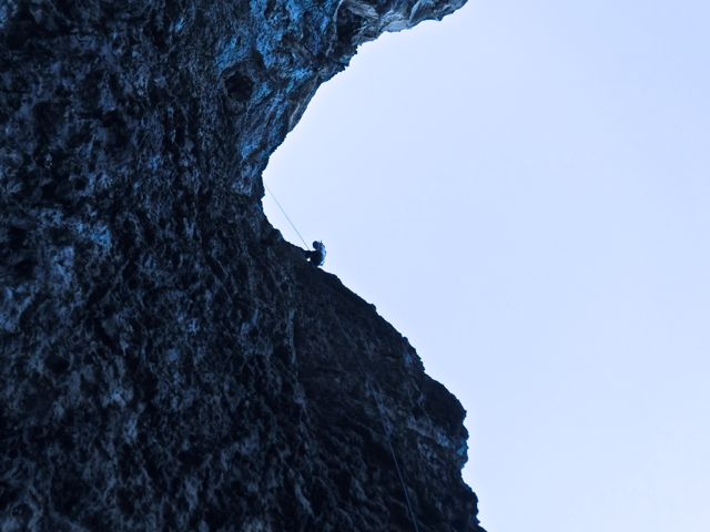There are two bolts in the second pitch. It’s so steep that my feet were higher than my head when I was drilling the first bolt. Somebody told me that a block might have fallen away here since. Chouinard Lost Arrows fitted perfectly, but in vertical placements that your body weight was pulling directly out.