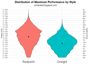 How do the results look like? First, we take a look at the overall difference between the maximum (redpoint) performance and the maximum onsight performance. The following graph shows the distribution of maximum performance for each climber in our dataset by style. This kind of graph is called a violin graph. The wider the violin, the more climbers there are with a certain maximum redpoint or onsight performance. The average maximum performance by style is illustrated by the black point in the middle of the violin. The average maximum redpoint performance is slightly above 7b+ or 5.12c. This is partly due to the fact that we disregarded climbers who do not climb above 6a or 5.10b. Apart from that the average ability of active 8a.nu users is quite high. Climbers who do not climb very often don’t bother much about creating and maintaining a public scorecard. The corresponding maximum onsight performance is slightly above 7a or 5.11d. This indicates that the average onsight level is approximately three grades below the maximum performance.