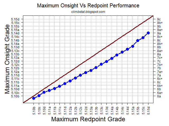 The following graph shows how the redpoint-onsight performance gap across all grades. On the x-axis, we have plotted the maximum (redpoint) performance. The y-axis shows the maximum onsight performance. If climbers onsighted grades similar to their redpoint performance, we would see a straight 45 degree line (indicated in red). The onsight performance is as one would expect, lower than the maximum performance and this is why the blue points are below the red line. It is apparent that the difference is small for climbers with a relatively low maximum performance and it widens for higher able climbers. This indicates that an onsight becomes harder the harder you climb. The average onsight maximum is 2-3 grades lower for climbers who climb up to 7a or 5.11d redpoint but it increases to almost 4 grades for climbers with a maximum grade of 8a or 5.13b (and still widens further). Interestingly, the gap again seems to be a little lower for the few climbers who can climb 9b or 5.15b or higher.