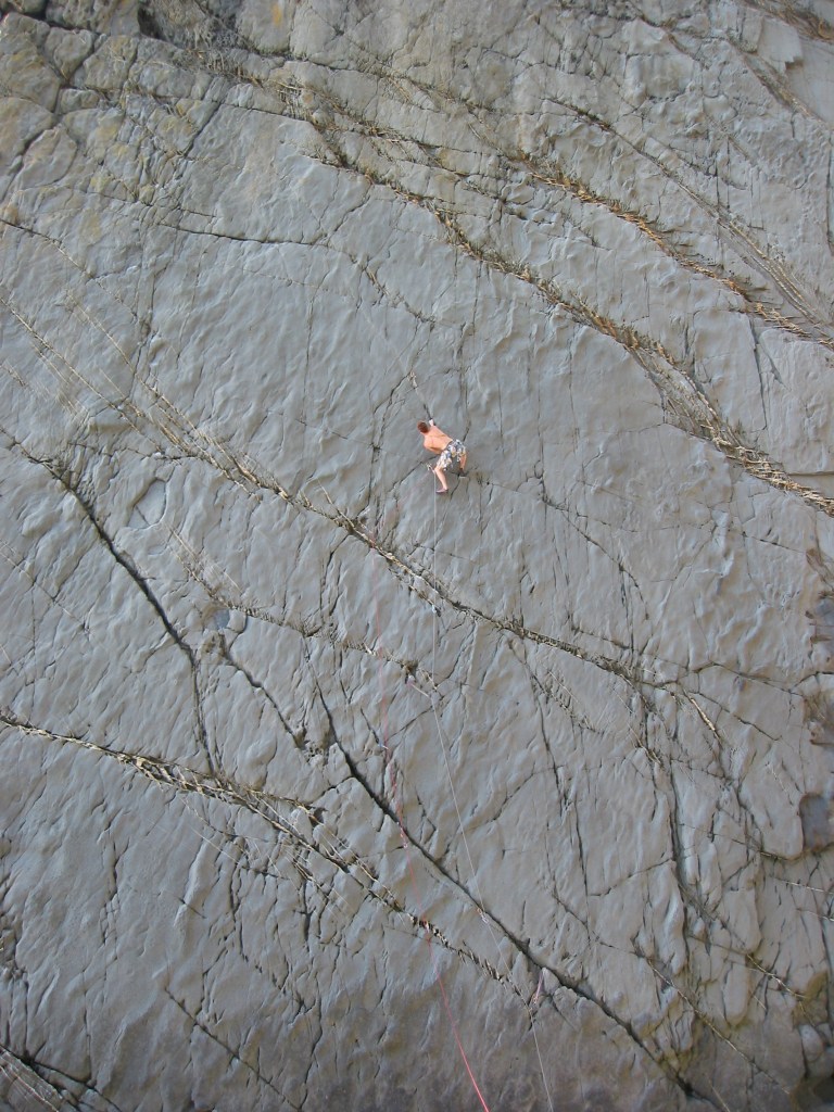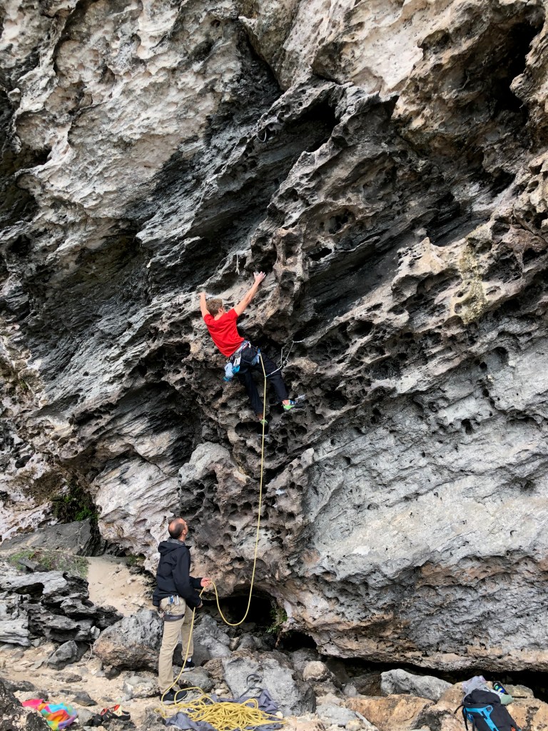 This part of the crag is high up and exposed. With spaced threads, it feels more like deep water soloing than sport climbing – you are simply going to fall into space – deep air? and then lower to the ground as there is zero chance of getting back on the rock from the rope.