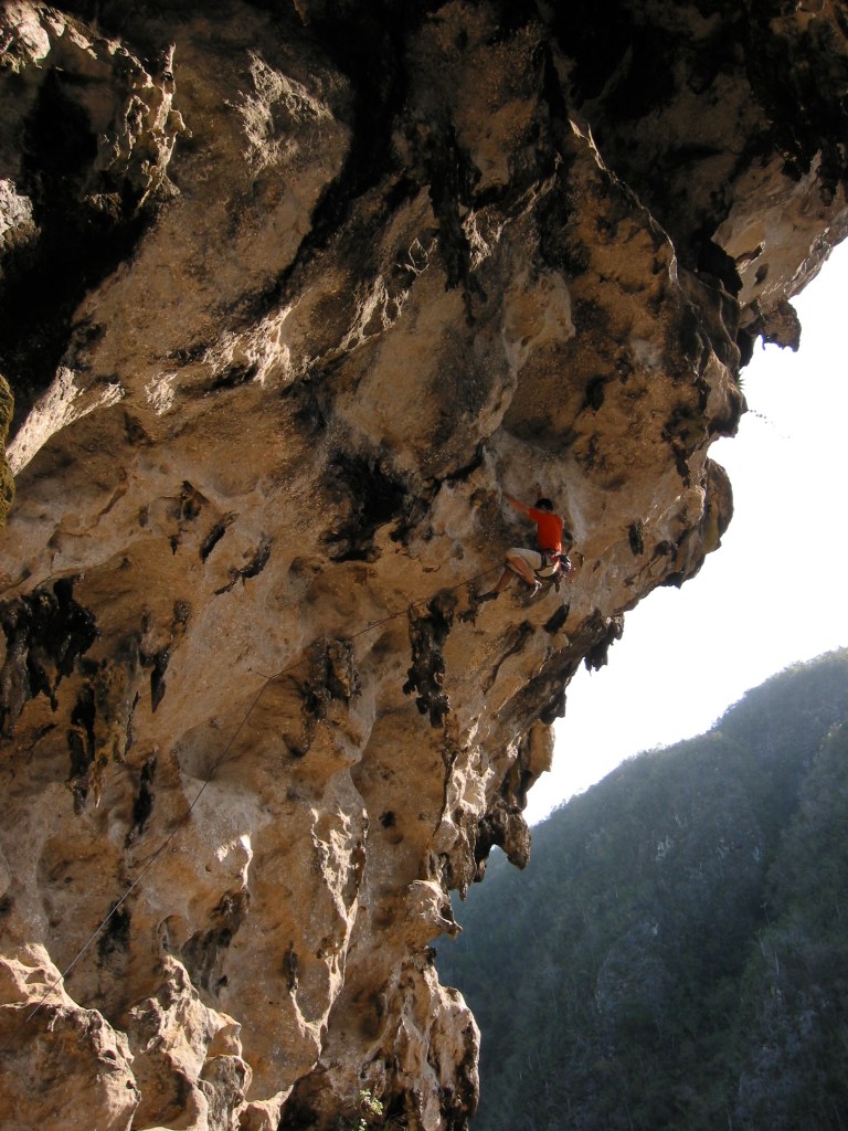 When suddenly Patrick walked around the corner (the real one) and stood next to my knackered old 40m Blue Water sport rope. He looked at me and with his best Franglaise asked if he could use my rope. I almost choked and said, ‘Of course mate’, if he felt he was up to it, ‘But please don’t fall off on it as it’s never taken any lobs before.’ Anyhow as expected Patrick floated up the route I’d been projecting for the last few weeks and with the occasional ‘formidable’ and ‘sacre bleu’ clipped the chains and casually lowered off. I think we chatted a bit about croissants and how fresh the bananas were that day ( the limit of my improved French).