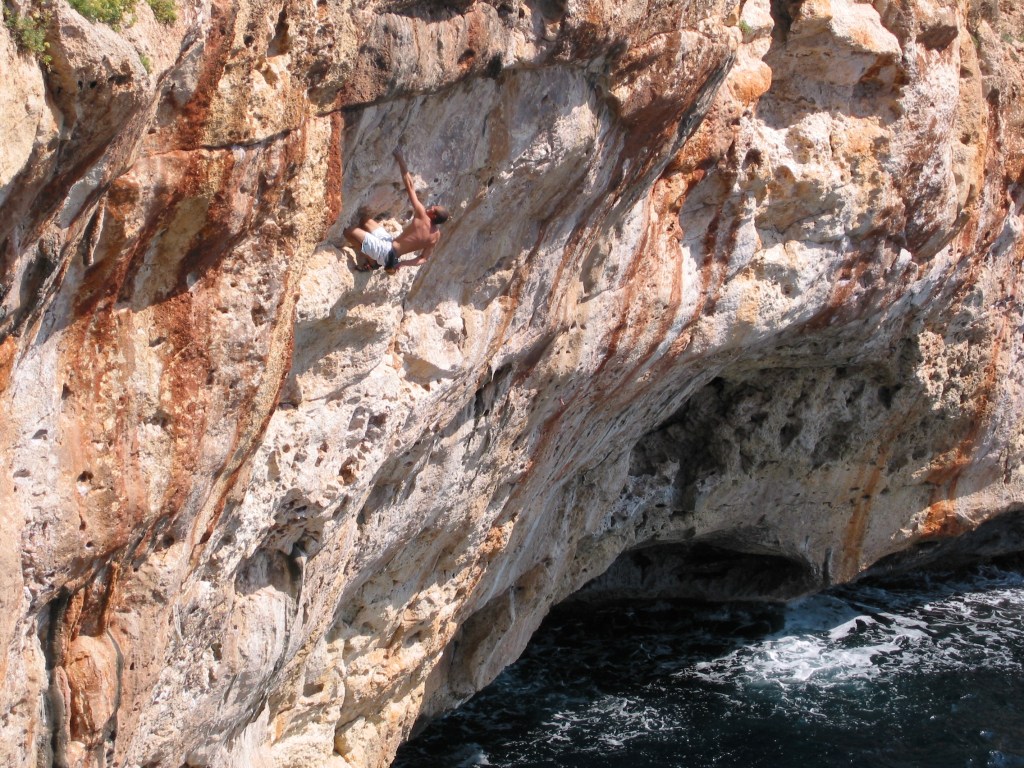 The rotten canine on the left-hand side of the cave could do with a root canal. Unfortunately the rock in the first 20 feet is very fragile. Climb the rounded pillar left of the cave, steeply past three drilled in-situ threads, to The Roost. There are numerous spikes upon which it is advisable to place additional protection slings.