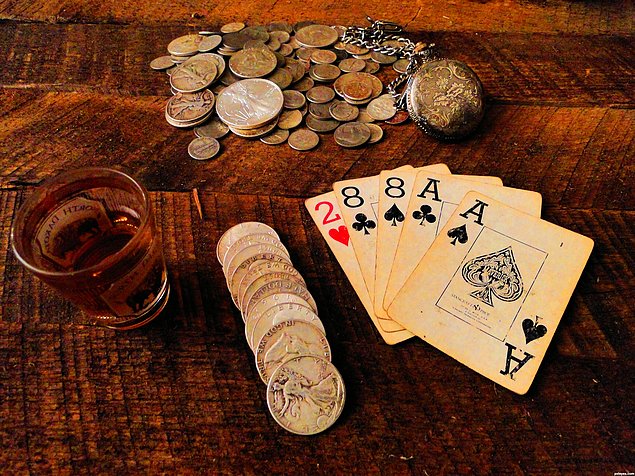 The dead man’s hand is a legendary ‘cursed’ poker hand usually depicted as consisting of the ace of spades, ace of clubs, eight of spades and eight of clubs with an undefined fifth card, has appeared or been referenced in numerous works of popular culture including One Flew Over The Cuckoo’s Nest. It is thought to have been the hand which Old West folk hero, lawman, and gunfighter Wild Bill Hickok was holding when he was shot in the back of the head by Jack McCall on August 2, 1876.