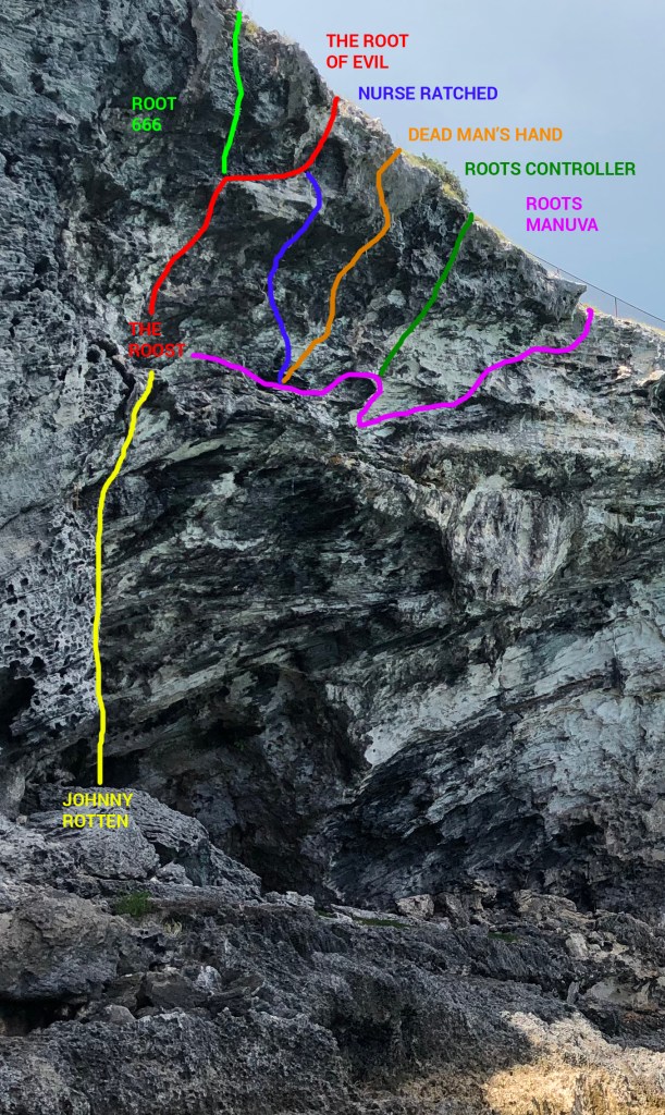A left-hand finish to The Root of Evil. Follow Johnny Rotten and The Root of Evil past three threads to the ledge. Step left on the lip and finish up the groove above. Grant Farquhar and Rob Sutherland 1 Feb 2020.