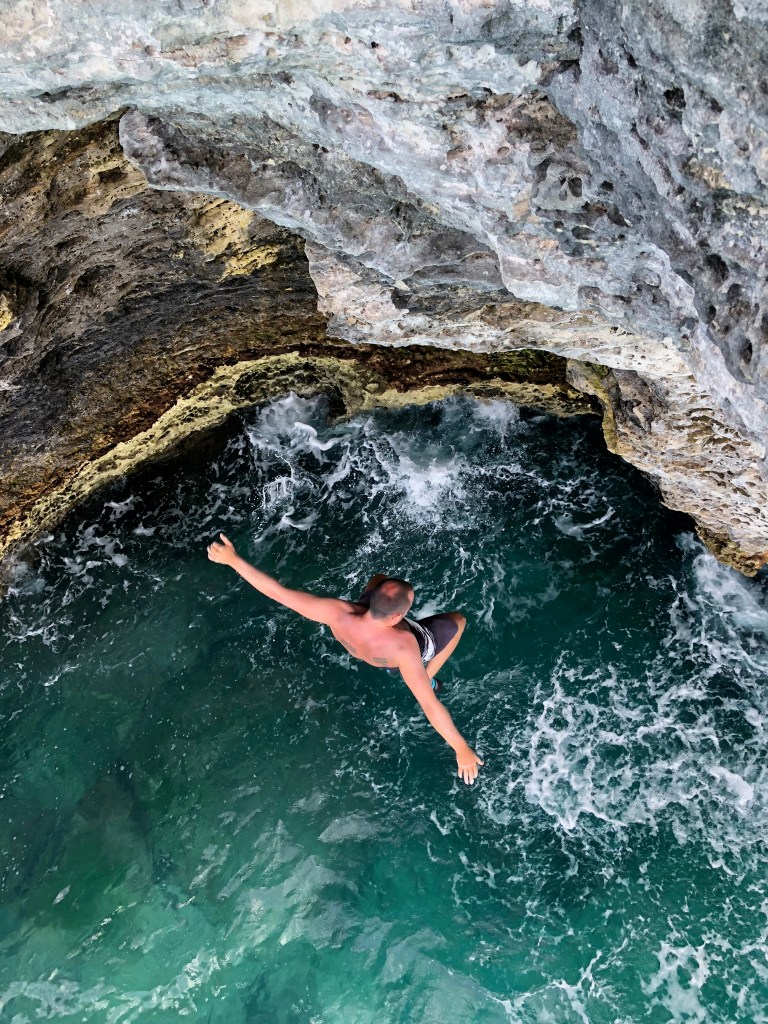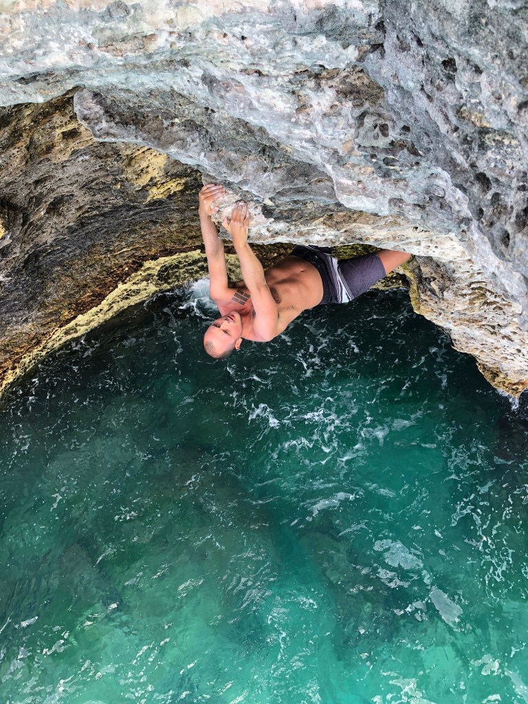 So the day after the hurricane had passed I went to try it on a 1.3m spring tide. First go I did the move on crimps to reach the first jug and then moved onto the next hold. I was chalking up on this when it snapped off without warning depositing me in the sea. I touched down on the reef but not too hard. Thirty minutes later I was back and did the crux to the first jug which promptly snapped off too. Now here, I think, is my mistake – I failed to take into account the waves that remained from the passage of the hurricane with their peaks and troughs.