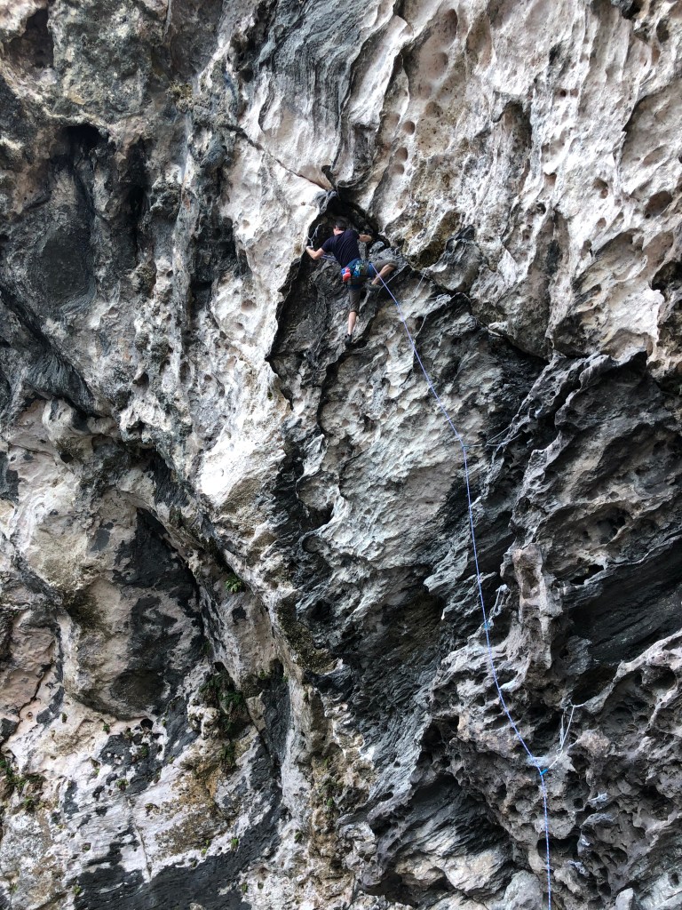 Devin and I caught a dose of the crabs at The Great Head today. Great conditions with a 15 knot SE wind. A very impressive triple-masted old-school pirate-type sail boat came out of the cut with the pilot boat while we were climbing. Once in deep water it put the sails out and then disappeared eastwards beyond the sea horizon so I guess they are heading to the Azores and beyond. Meanwhile, Rob and Ruth were beavering away on Rob’s project in the Great Cave.