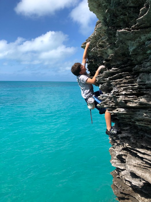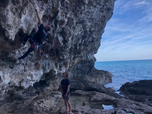 With a northerly wind and low humidity today conditions were perfect at the Great Head. Dreas and I climbed a route that I have been meaning to do for ages which gives a three-pitch expedition that feels much harder than 5.10a, although there are no hard moves anywhere. It has a great line, mostly good rock, big holds and wild exposure; it climbs through territory usually reserved for 5.12s and must be one of the best 5.10s I’ve climbed in Bermuda – Bermuda’s equivalent of A Dream of White Horses.